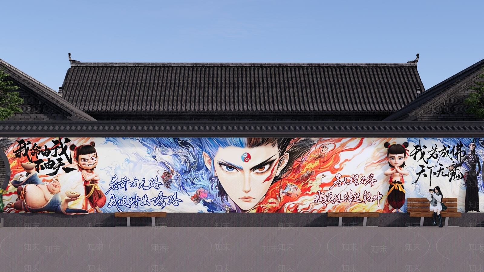 新中式景墙 哪吒闹海墙绘 网红打卡涂鸦墙 墙体艺术彩绘 国潮美陈打卡点