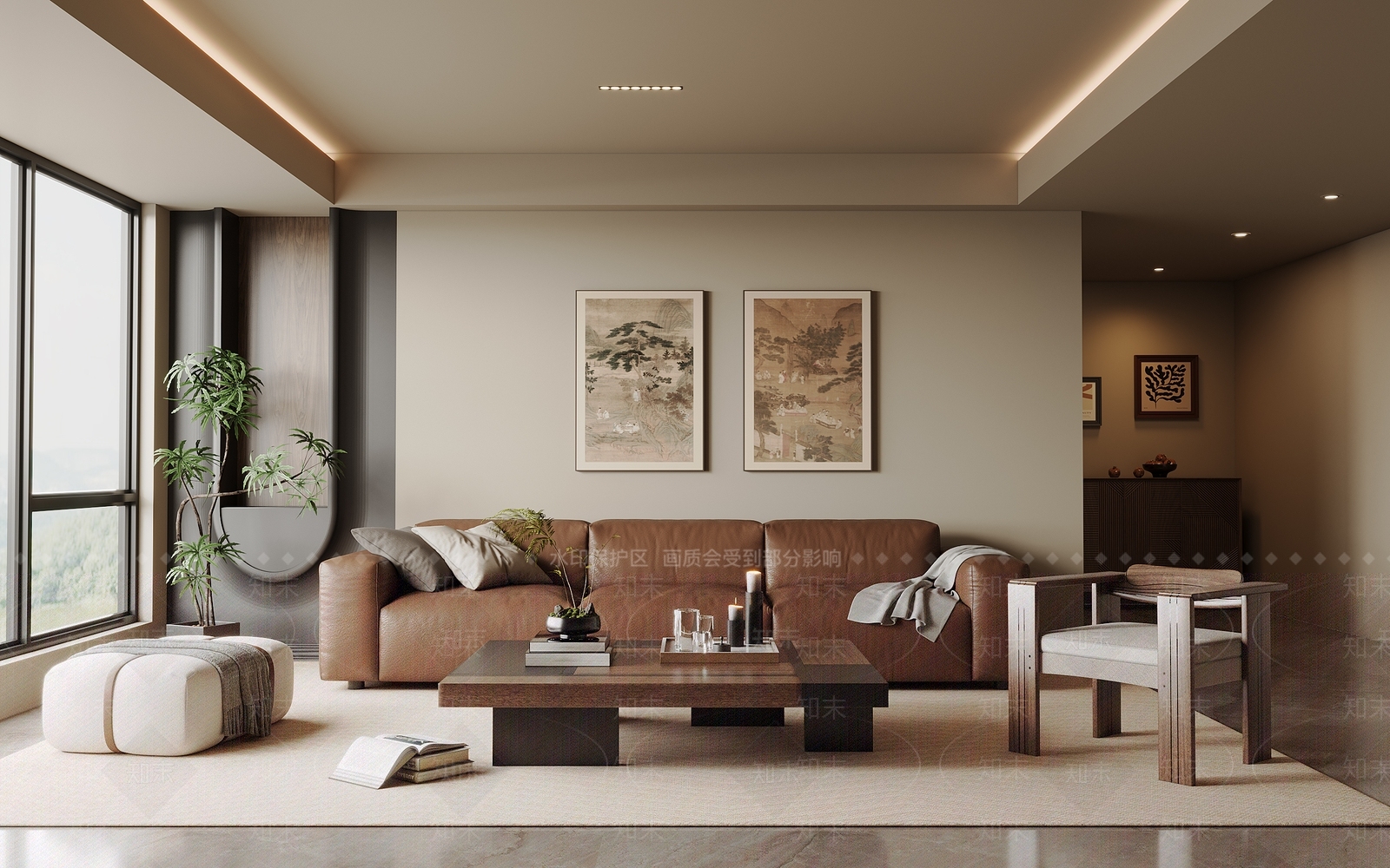 侘寂中古家居客厅 小户型客厅 三人位皮革沙发 实木茶几 沙发椅 宋氏风
