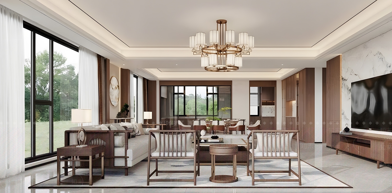 新中式家居客厅 新中式家居客厅 大户型客厅 沙发茶几组合 中式吊灯 客餐一体设计