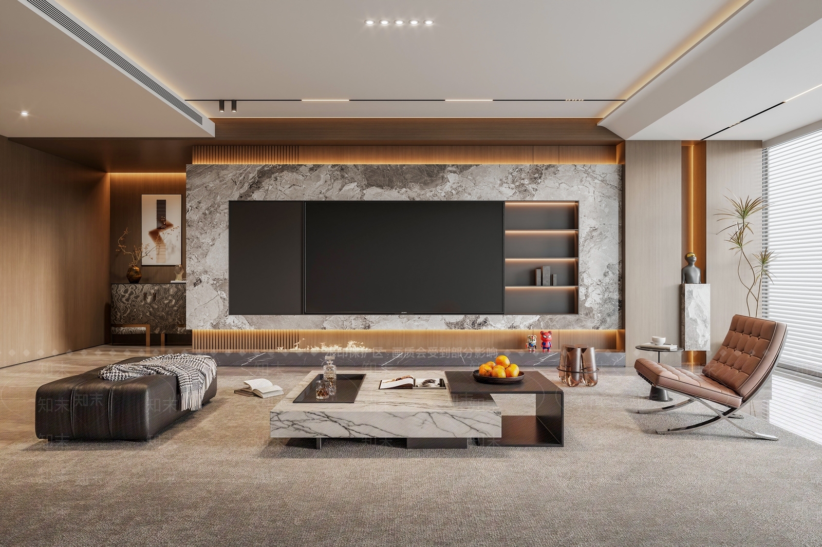意式轻奢家居客厅 客厅电视背景墙 石材背景墙 茶几休闲椅 无主灯客厅 装饰摆件