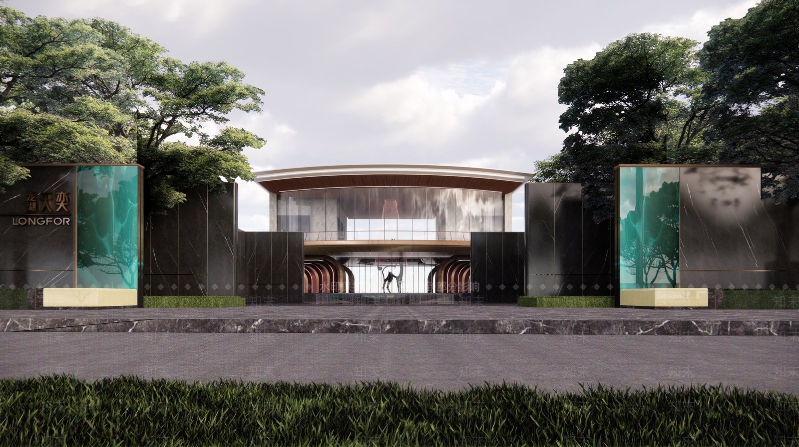 - 现代简约小区景观 轻奢小区中轴景观 新中式流水景墙 新中式小区景观 小区入口对景景墙