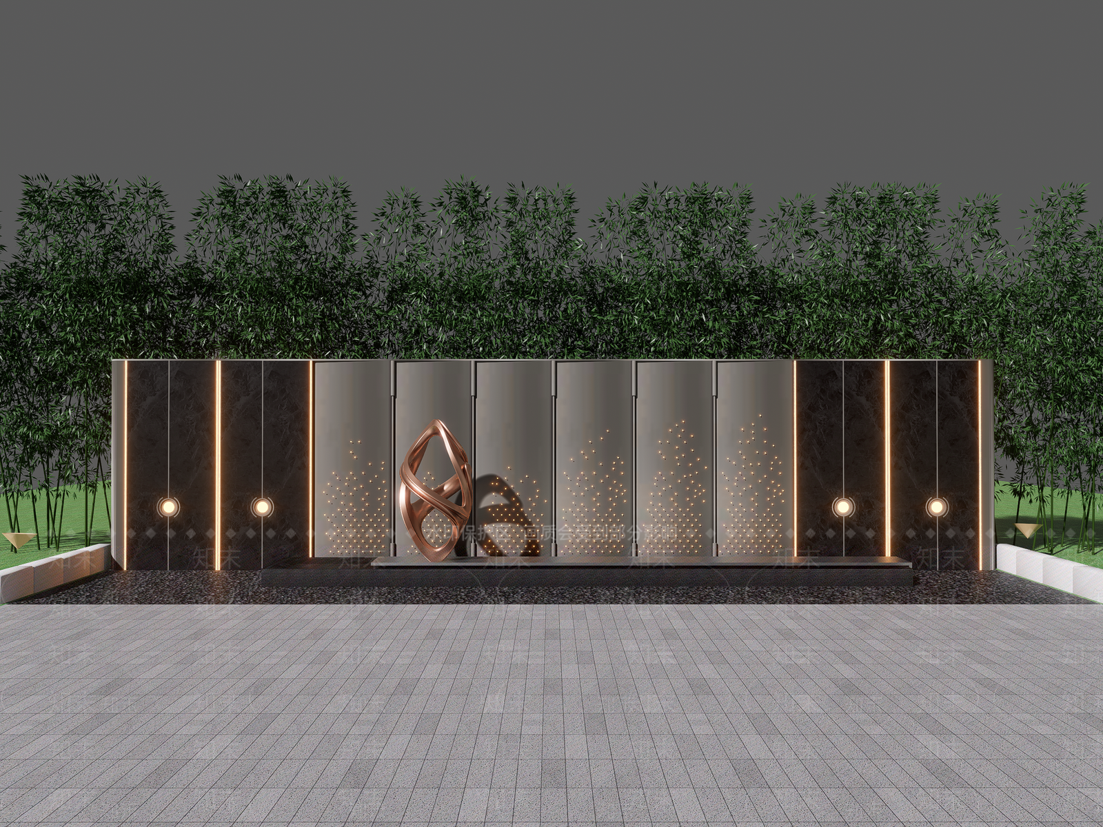 现代新中式景墙 样板区示范区住宅 金属穿孔石材组合 跌水雕塑小品墙
