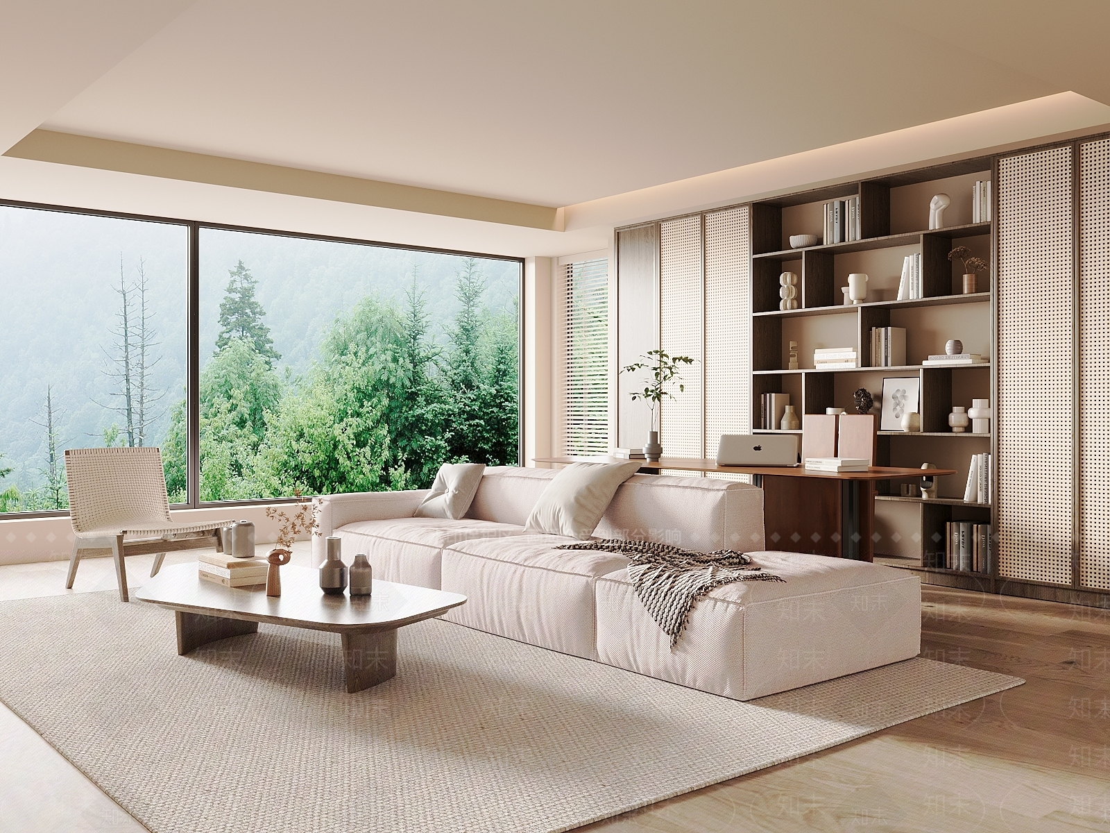 侘寂中古家居客厅 沙发茶几组合 布艺沙发 实木书桌椅 实木书柜 客厅书房