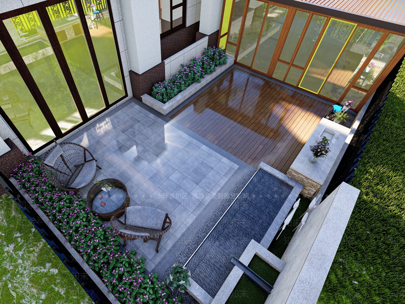- 新中式别墅庭院 现代诧寂美拉德 内庭天庭阳台屋顶 原木混凝土布艺 茶歇洽谈放松惬意