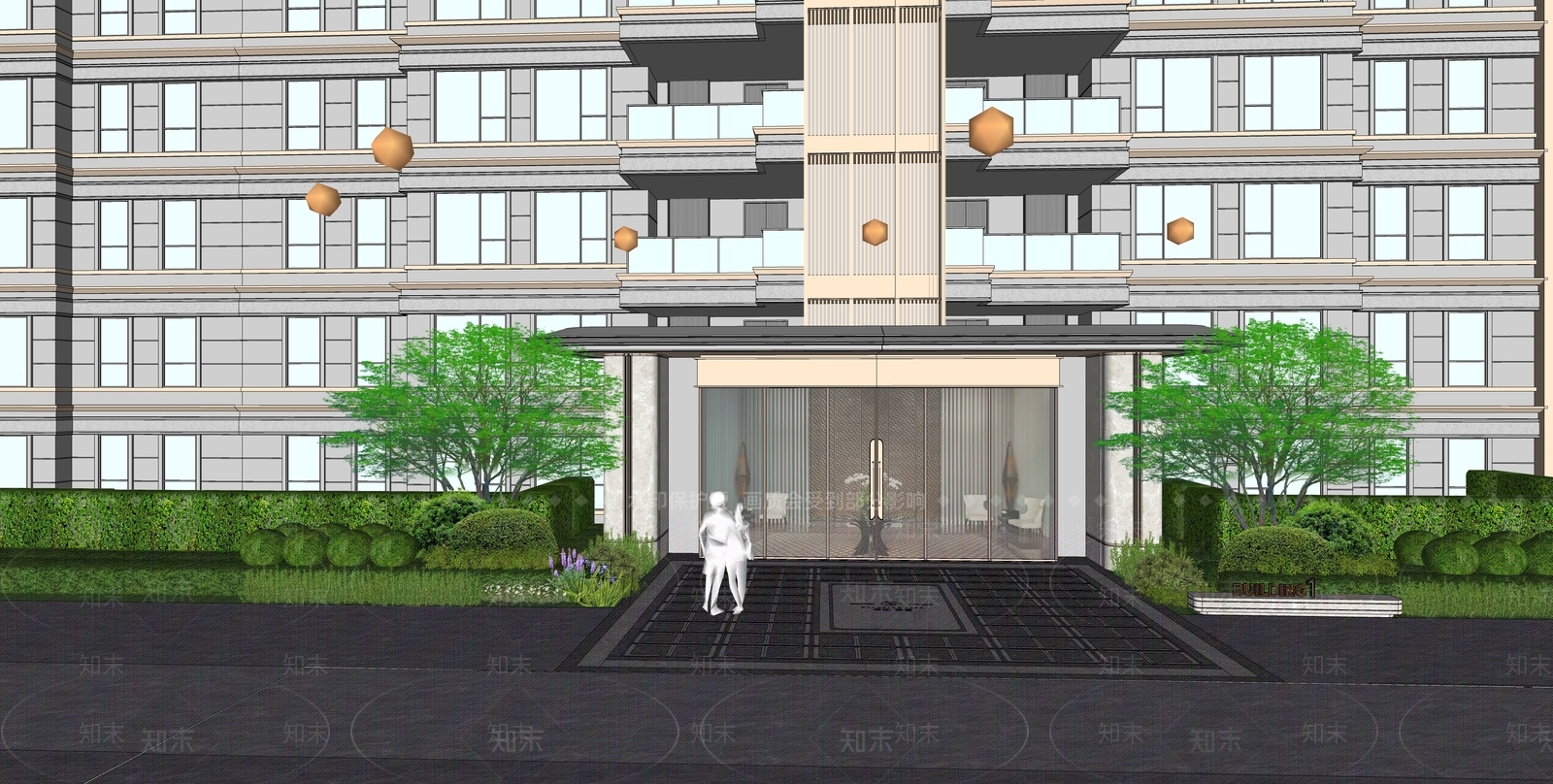 现代高层住宅 单元门头 架空层入户门头 小区入户 入户铺装