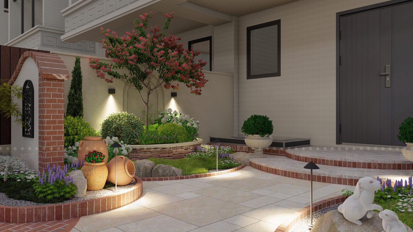 - 新中式别墅庭院 现代别墅花园景观 植物 石子