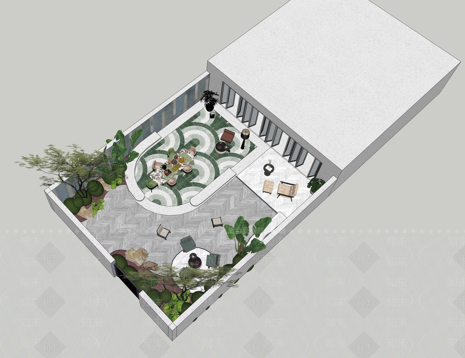 - 新中式别墅庭院 现代别墅花园景观 植物 石子