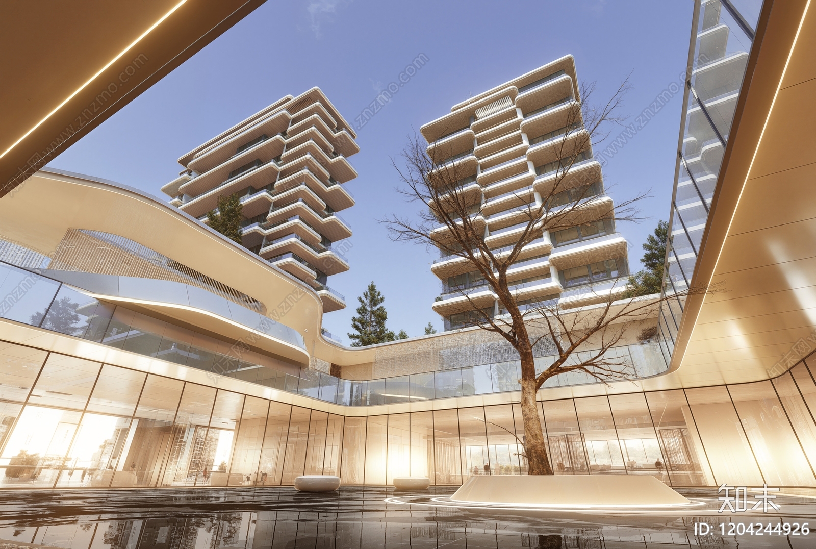- 现代轻奢小区建筑 现代轻奢高层小区 现代轻奢高层住宅 底层架空连廊系统 下沉庭院 中心景观