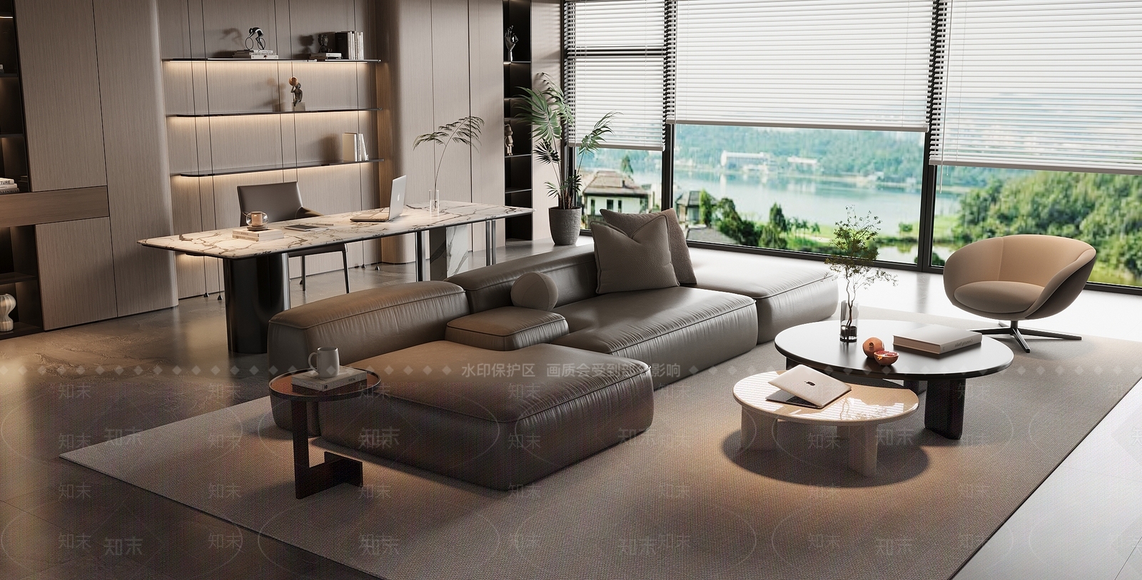 现代意式家居客厅 大平层客厅 沙发茶几组合 皮质沙发 大理石书桌椅 成品书柜