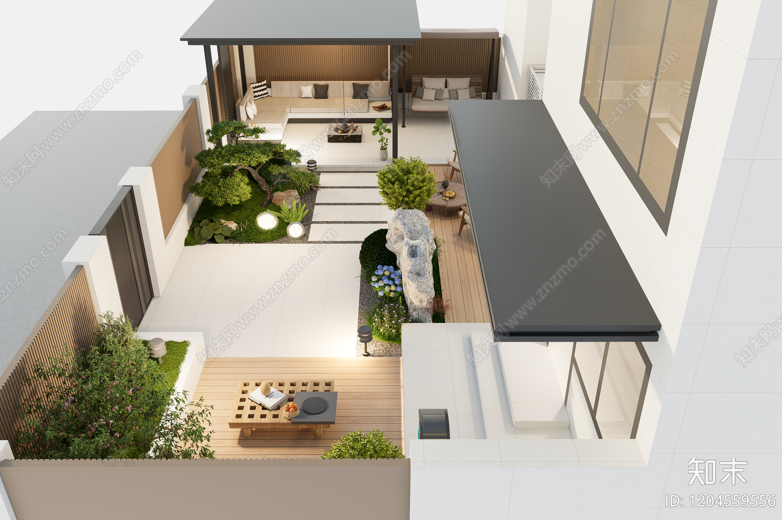 - 现代中式别墅庭院 庭院景观 别墅庭院 屋顶花园 乡村庭院