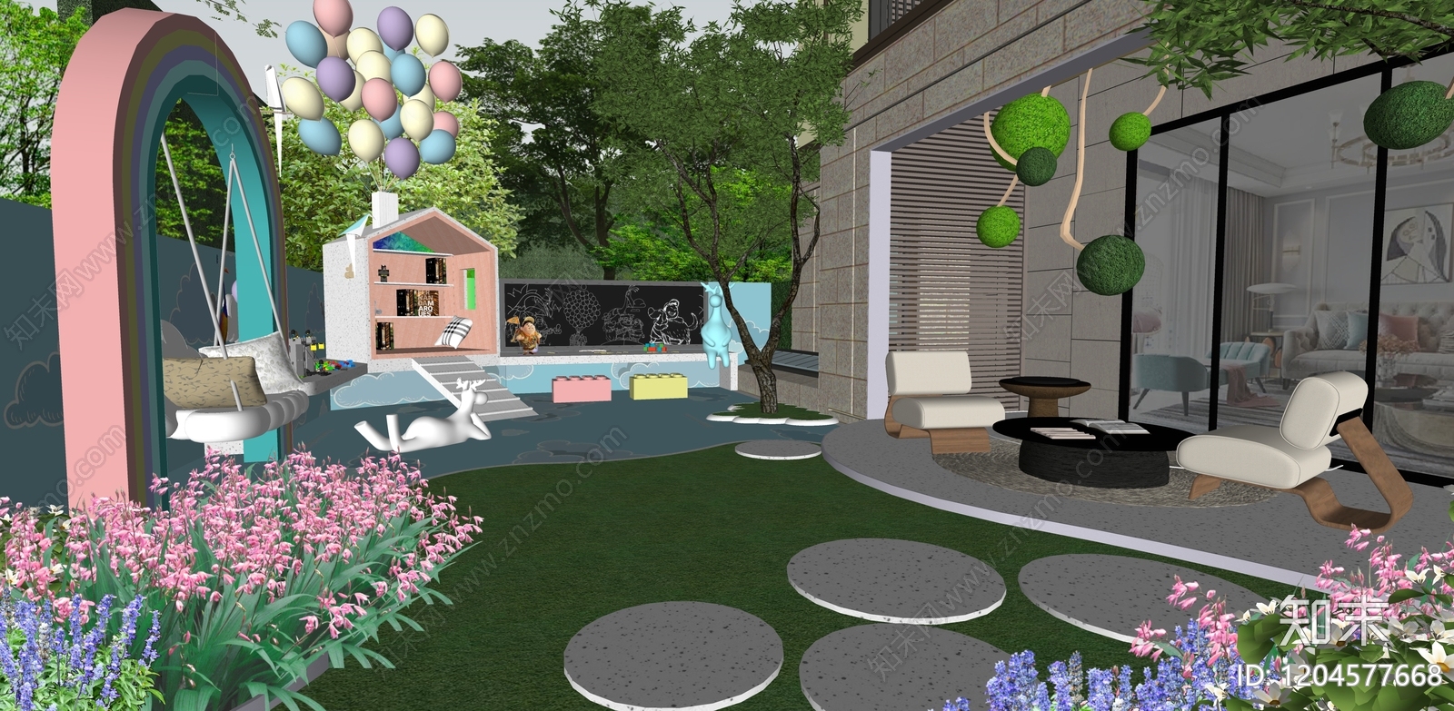 - 现代中式别墅庭院 庭院 别墅庭院 下沉庭院 庭院儿童 庭院花园