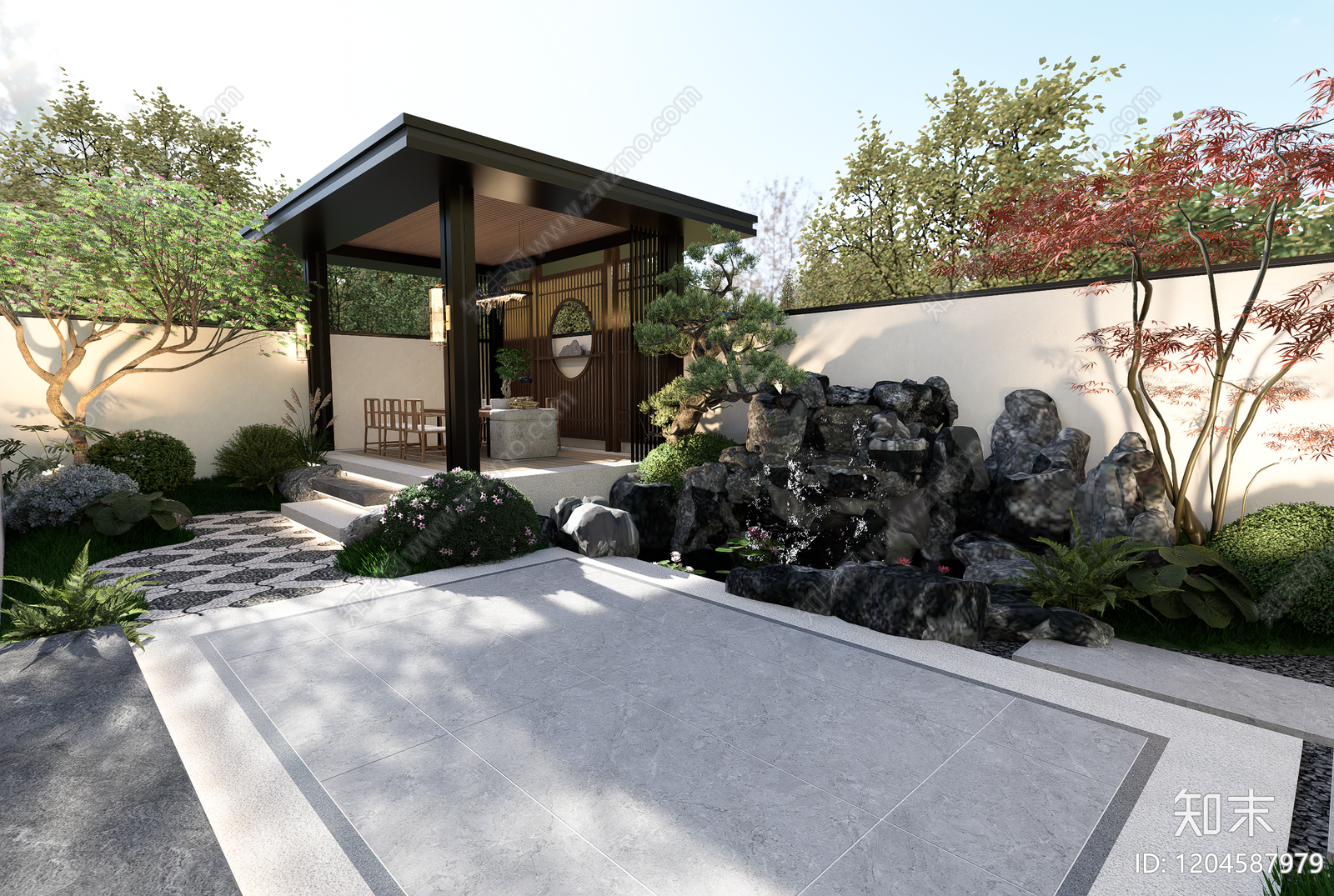 - 新中式现代别墅庭院 现代中式庭院 假山鱼池 景观亭 流水假山 新中式庭院