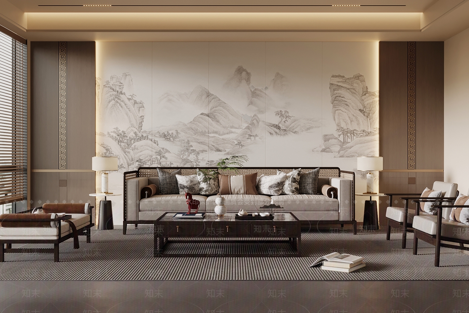 新中式家居客厅 新中式客厅 沙发背景墙 沙发茶几组合