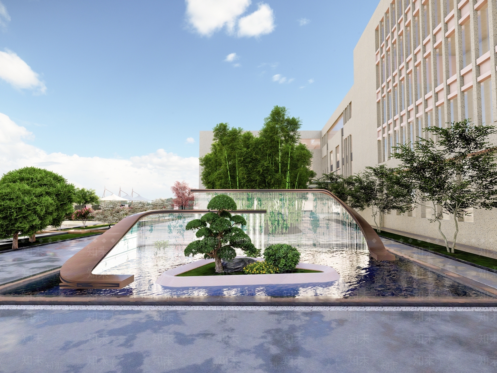 - 现代其他水景设施 水景 跌水 镜面水景 自行车位