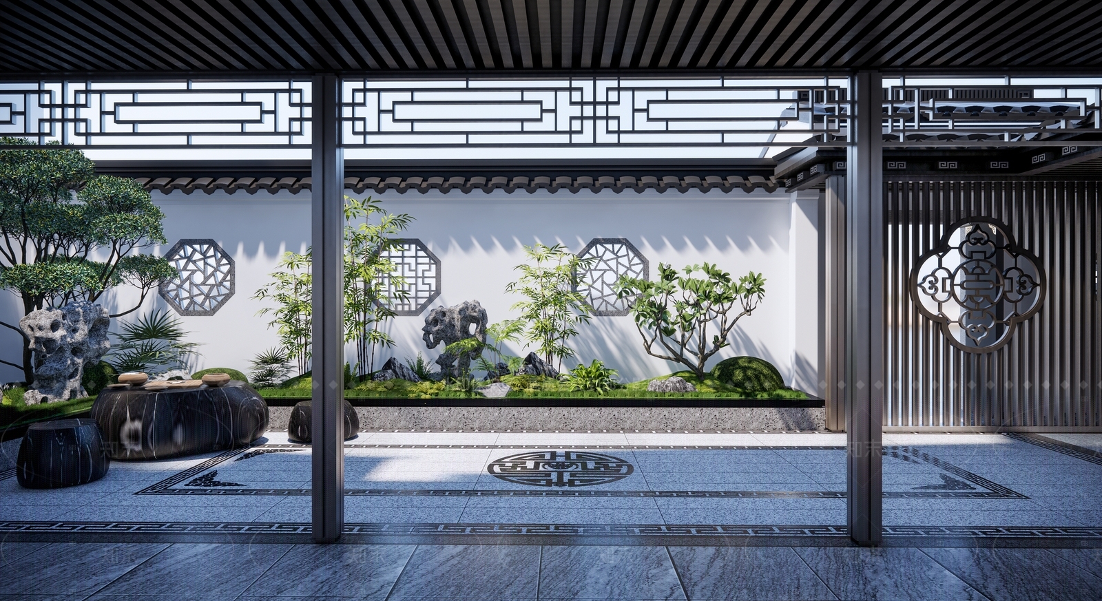 新中式中式别墅庭院 新中式庭院 中式别墅庭院 小型庭院 中式铺装棋桌 徽派建筑庭院
