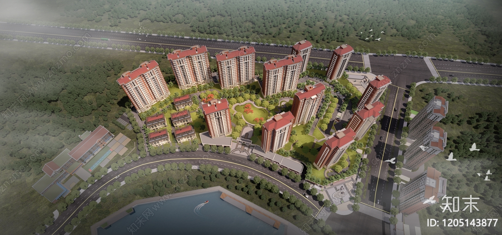 - 现代新中式小区建筑 新中式居住区 居住区鸟瞰 现代高层 新中式高层