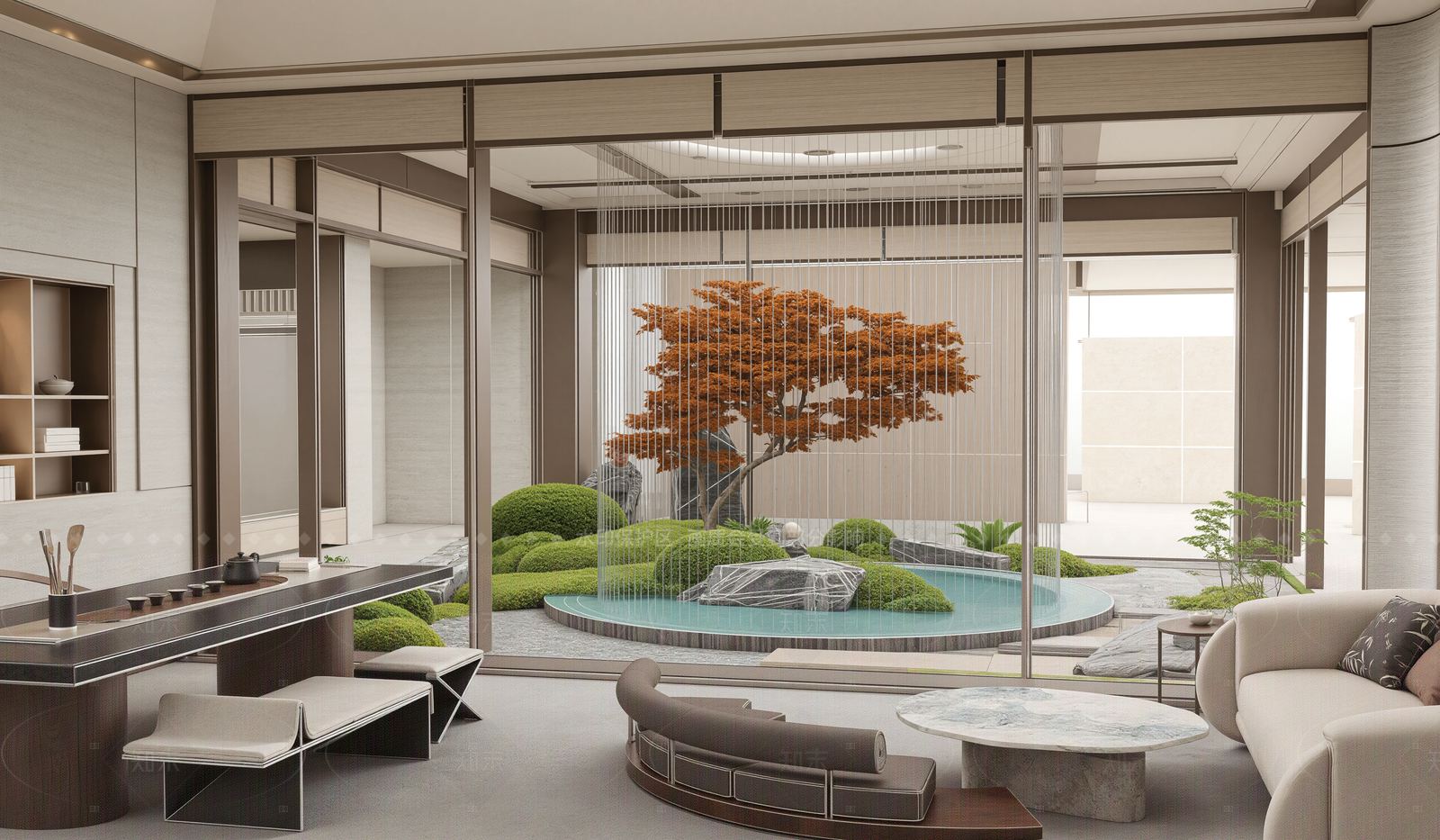 - 新中式中式室内景观 天井室内景观 下沉中庭景观 中庭景观 下沉禅意水景