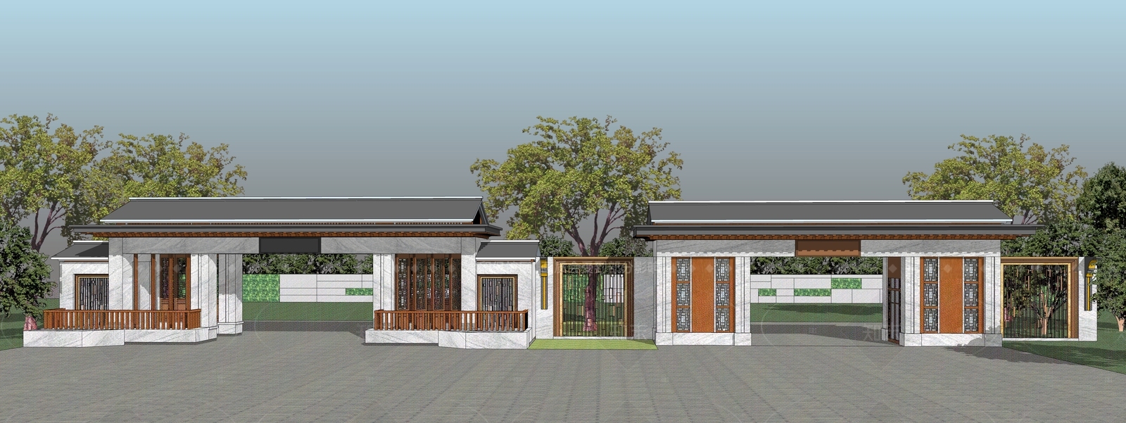 - 现代新中式入口大门 小区入口大门 门楼 坡顶 复古