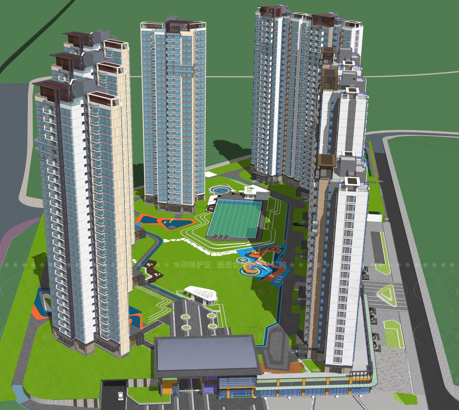 - 现代小区景观 景观水系 小区景观 绿化 小区 居住区