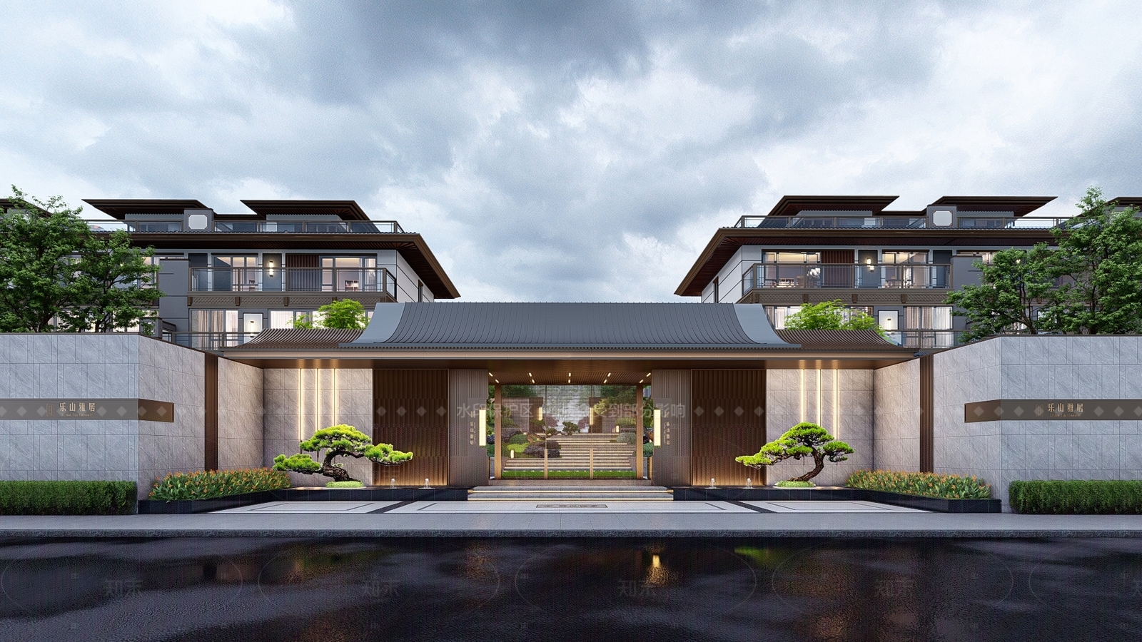 - 现代新中式入口大门 新中式大区门头 轻奢金属格栅门头 大区人车分离入口 对称式社区入口 住宅小区主入口
