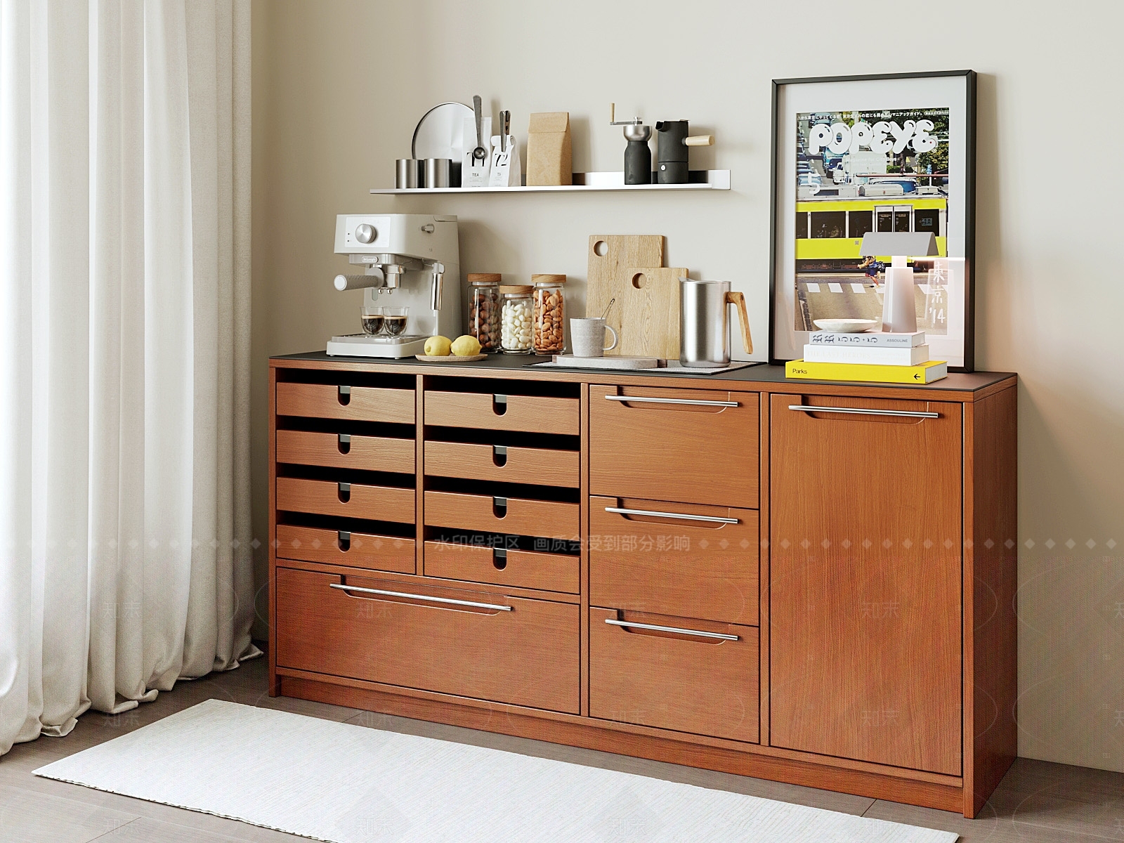 - 现代中古餐边柜 包豪斯奶油侘寂 简约法式原木禅意 茶水备餐鞋冰箱柜 台灯香薰酒咖啡机 金属不锈钢台面木