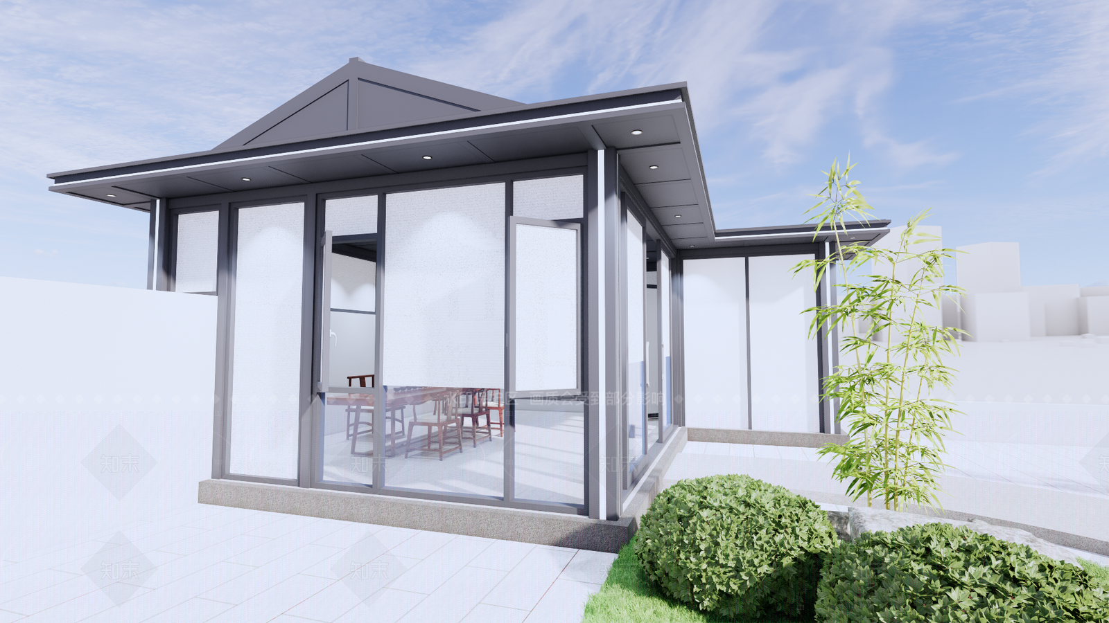 - 现代极简亭子 现代轻奢景观亭 度假风茶亭卡座 特色格栅编织网 特色景观灯 户外沙发茶几