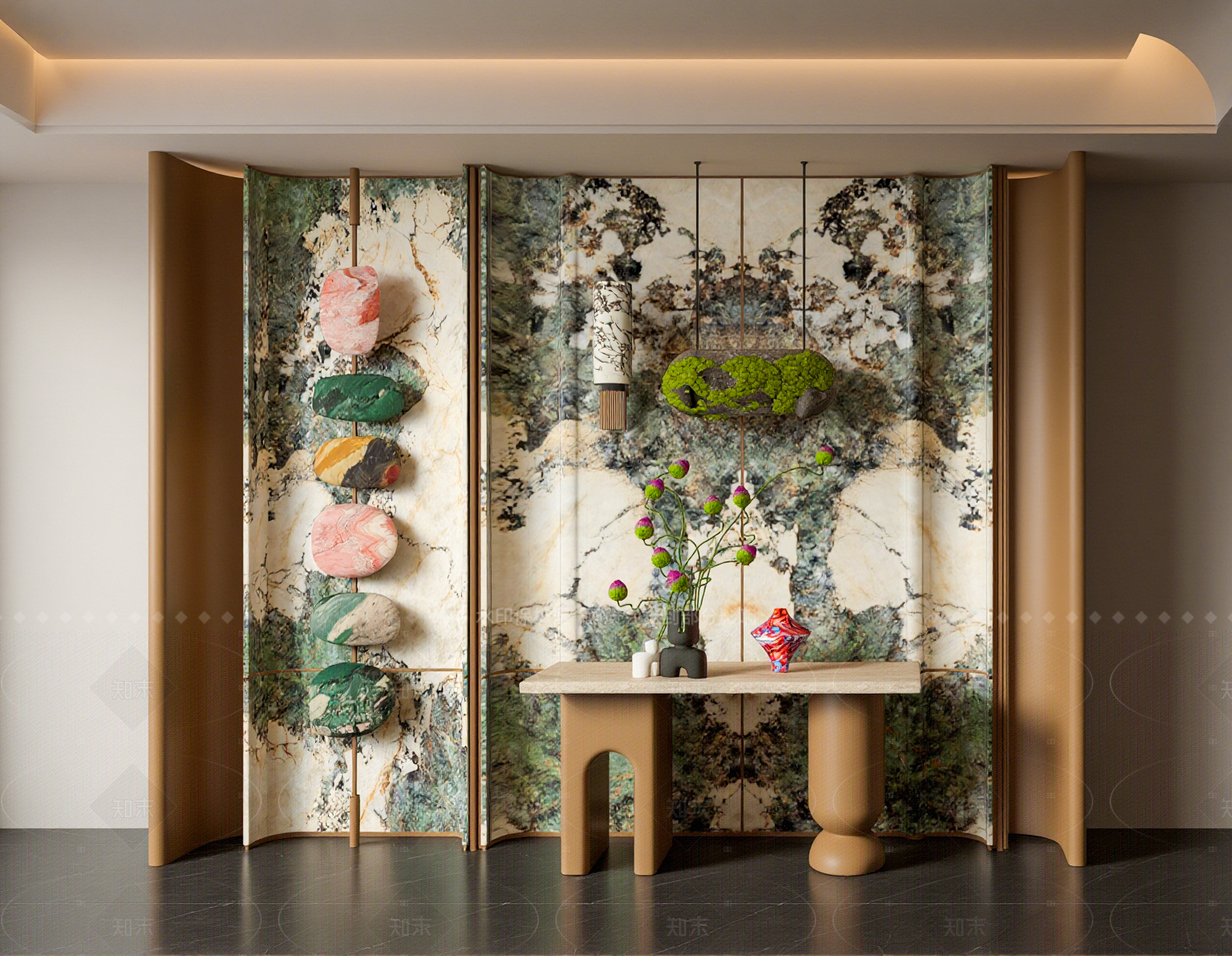 - 现代轻奢背景墙 立体背景墙 洞石护墙板 玄关背景 石材背景墙 客厅背景墙