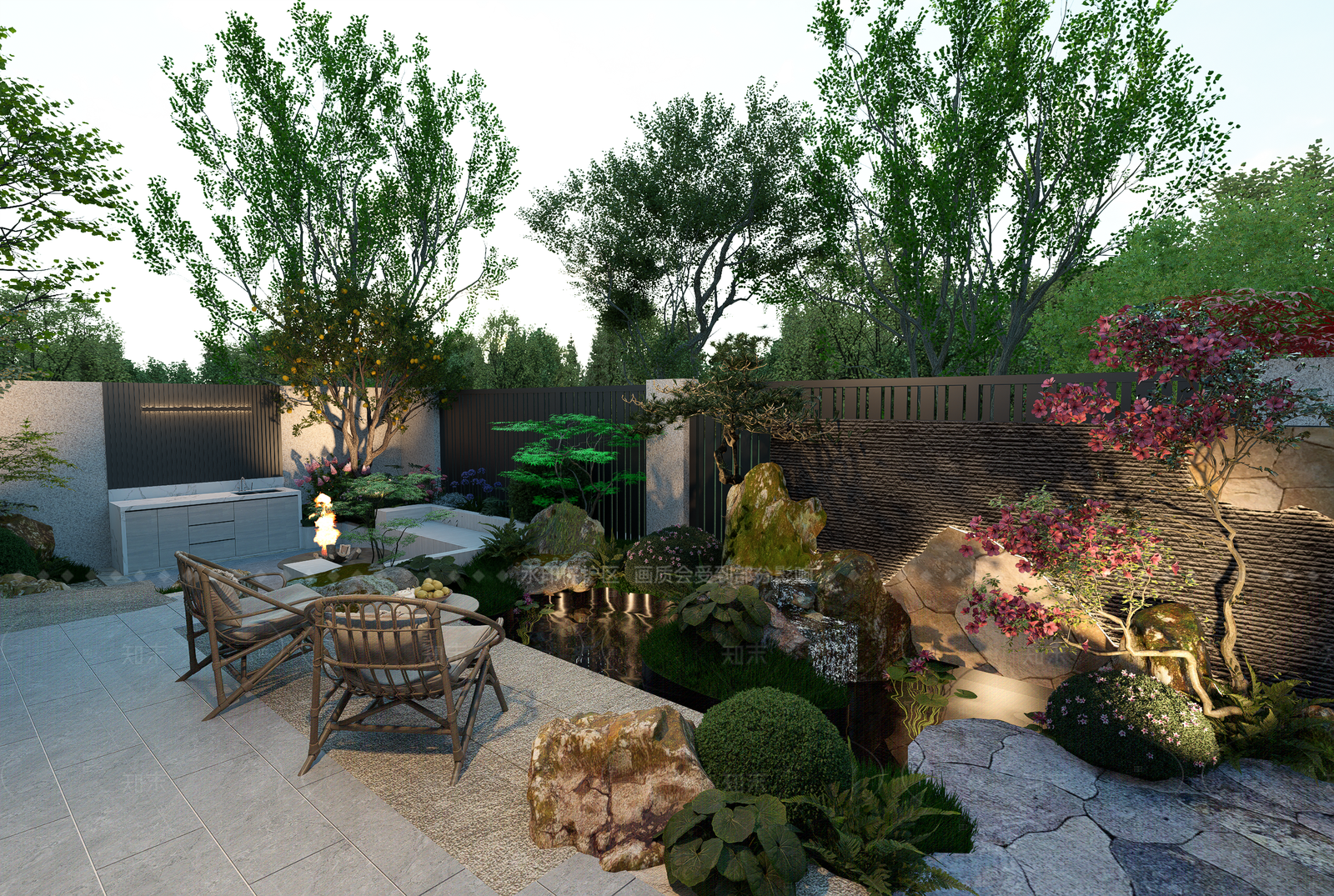 现代禅意别墅庭院 现代自然庭院 山水景墙 石皮景墙 鱼池景观 假山流水