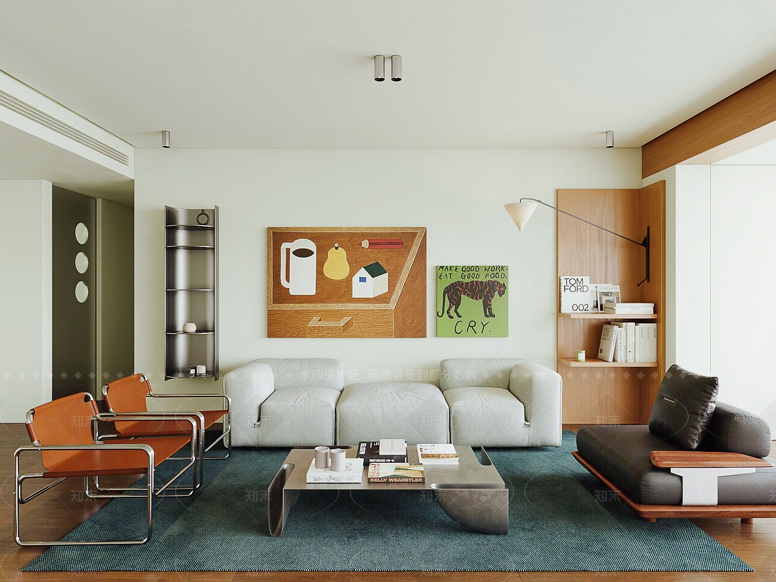 - 现代中古家居客厅 包豪斯奶油侘寂 简约法式原木禅意 沙发茶几组合书柜 装饰摆件香薰书籍 金属不锈钢水泥墙