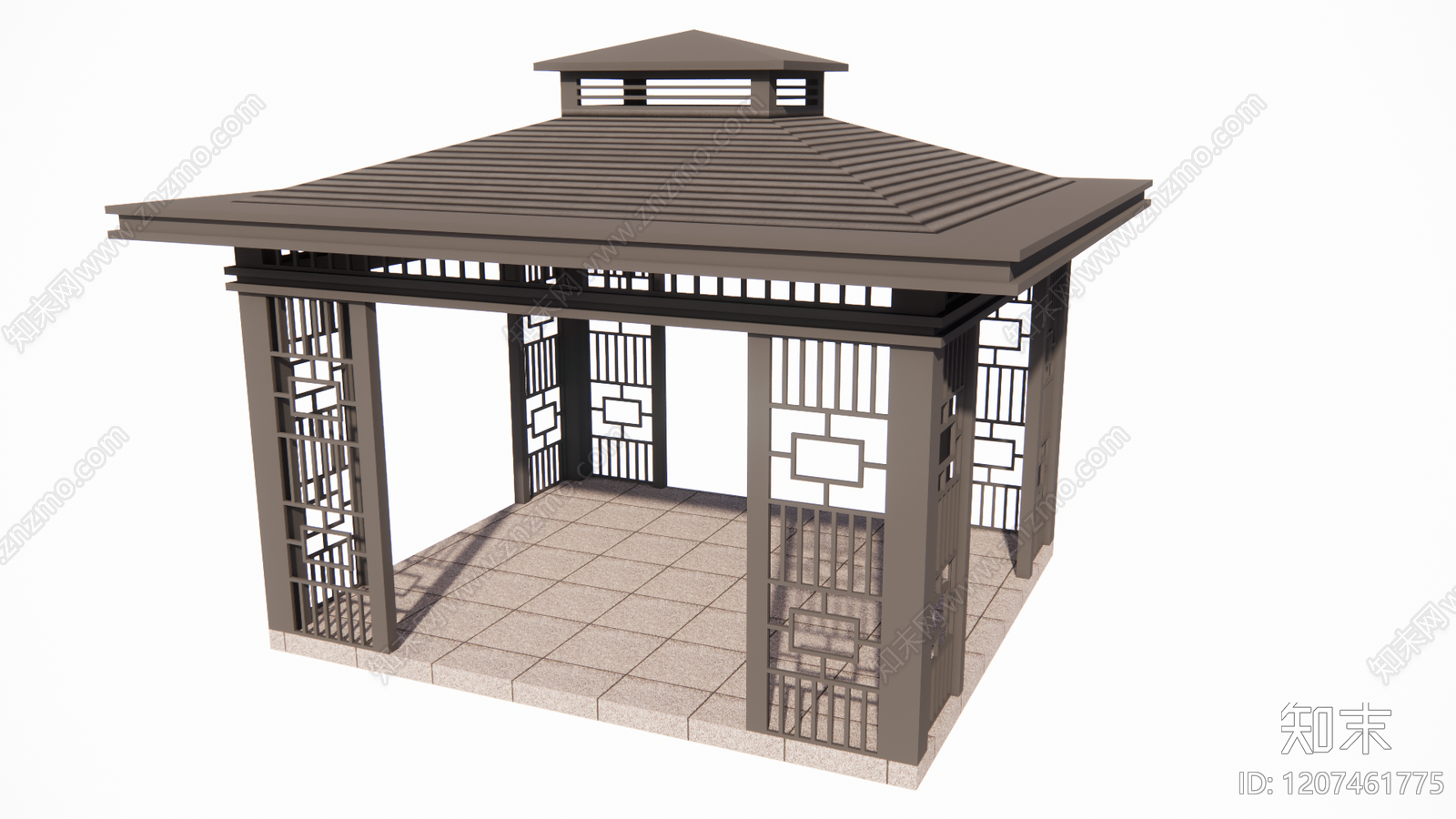 - 新中式亭子 新中式观景亭 斜屋顶特色格栅 挂帘文化铺装 梅花纹
