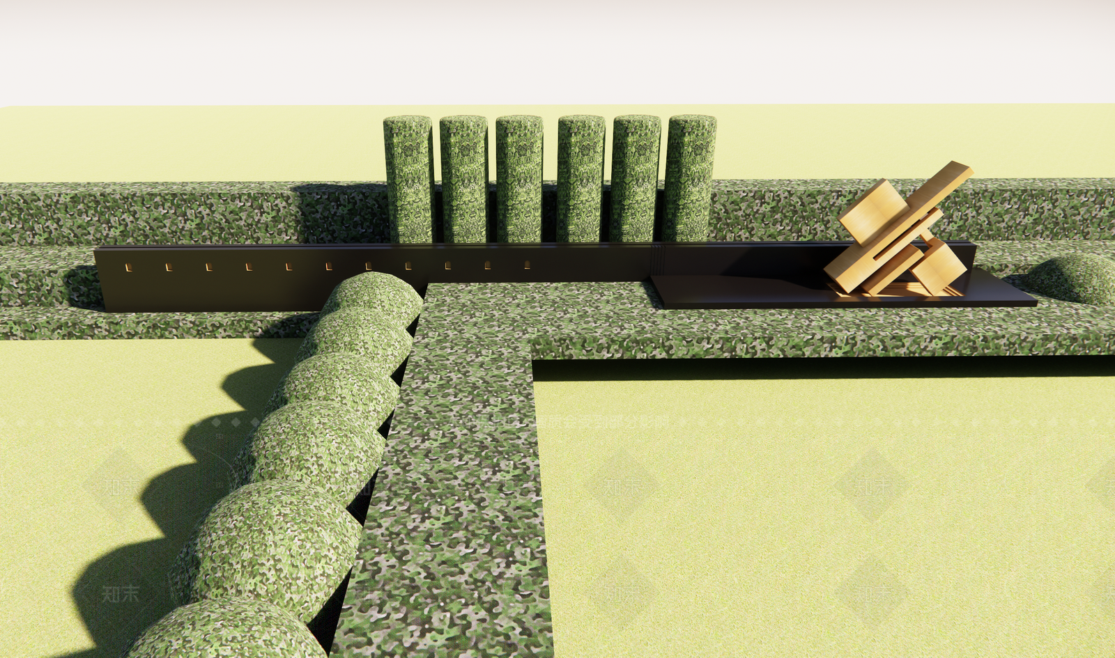 轻奢复古景墙 绿篱造型景墙 金属几何雕塑景墙 现代轻奢对景景墙 小区阳光草坪景墙