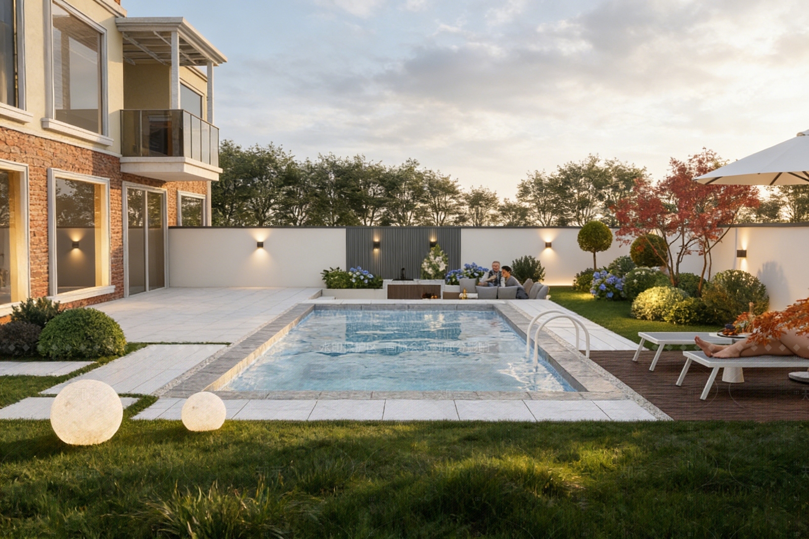 现代简约别墅庭院 现代泳池庭院 现代小清新庭院 现代家庭泳池 庭院草坪水景景墙 奶油风庭院