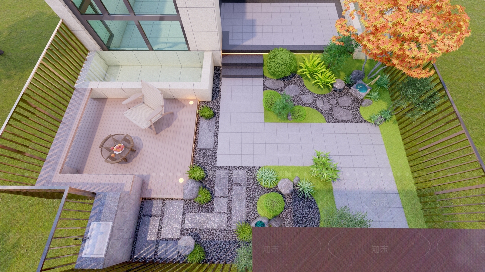 新中式中式别墅庭院 木平台 汀步 小院 院子 别墅