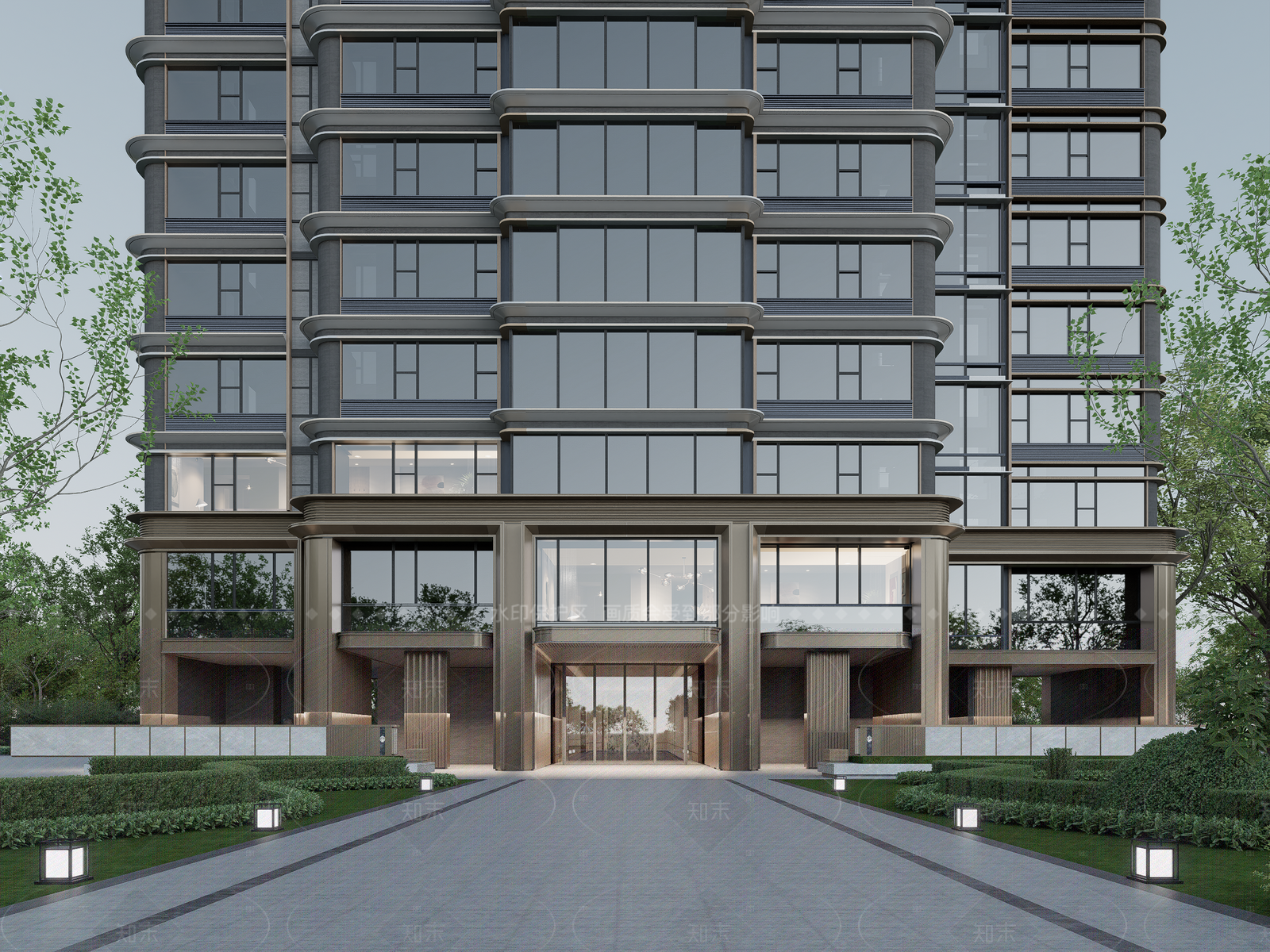- 现代轻奢高层住宅 高层大平层建筑 入户门头景观 首层架空 精工立面 轻奢住宅建筑