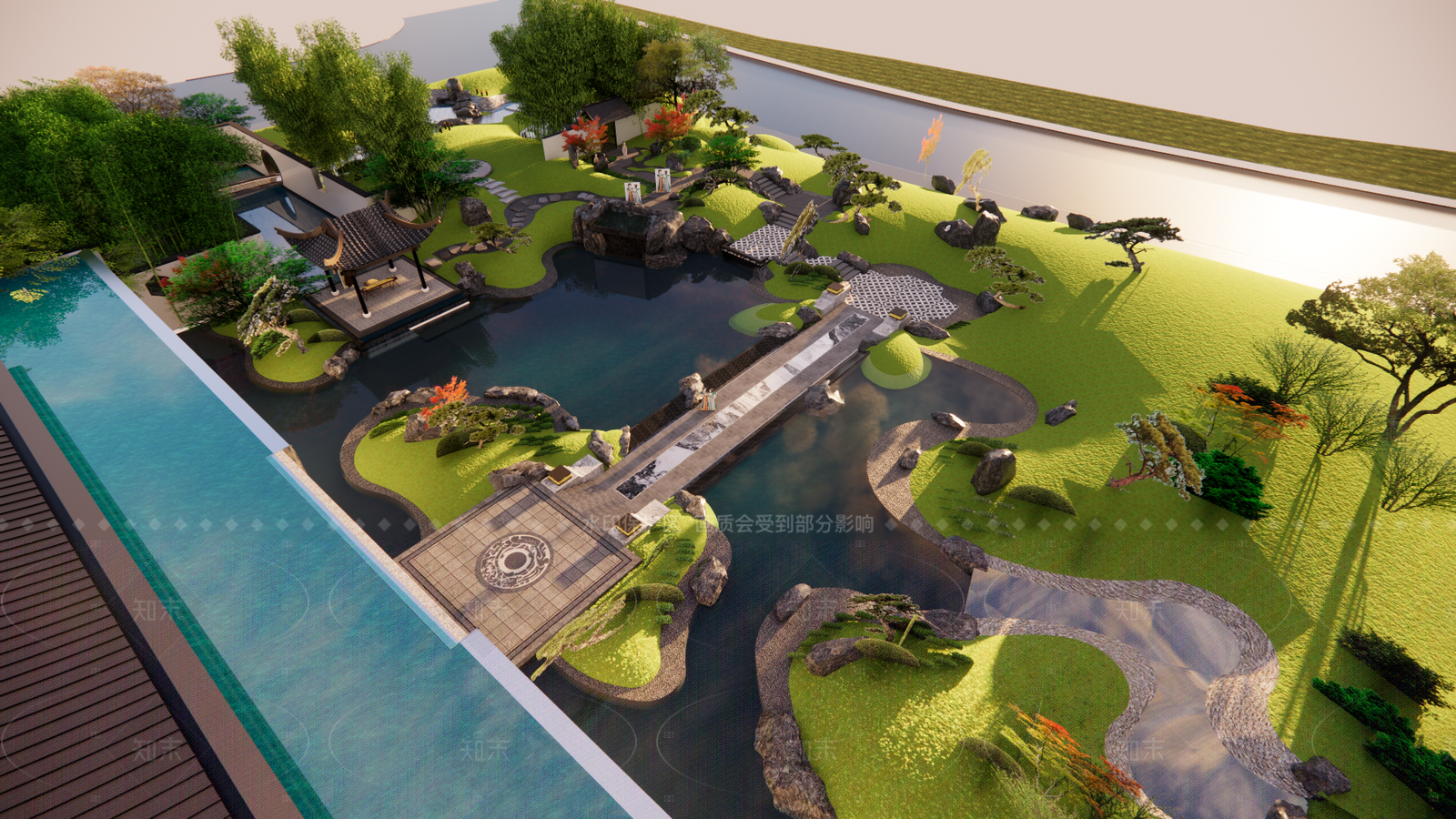 - 新中式小区景观 宋式禅意景观庭院 新中式示范区景观 景观亭廊架高差 下沉庭院叠级水景 溪流拱桥