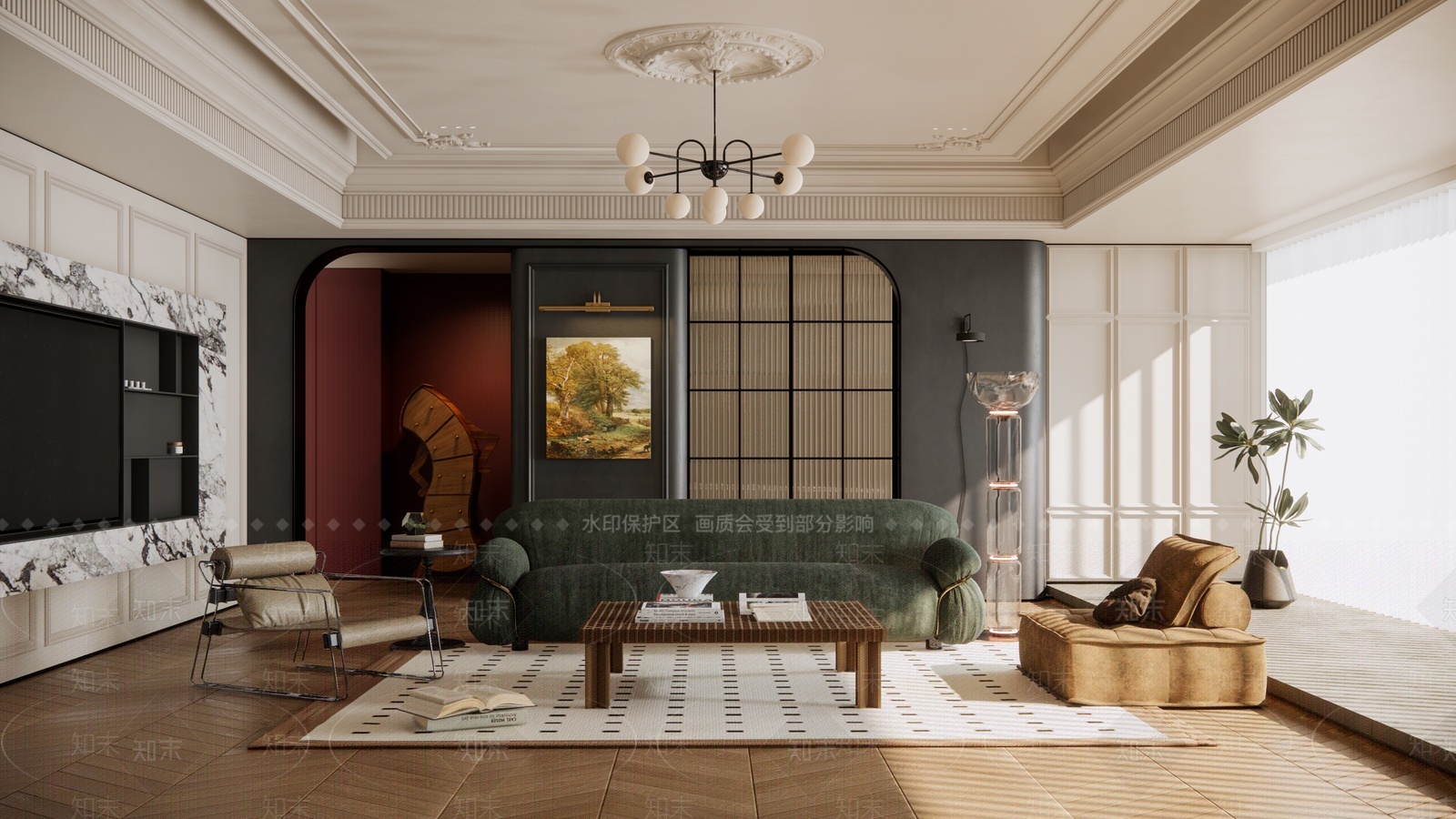 法式中古风客厅 布艺多人沙发 休闲单椅 茶几 金属吊灯 落地灯