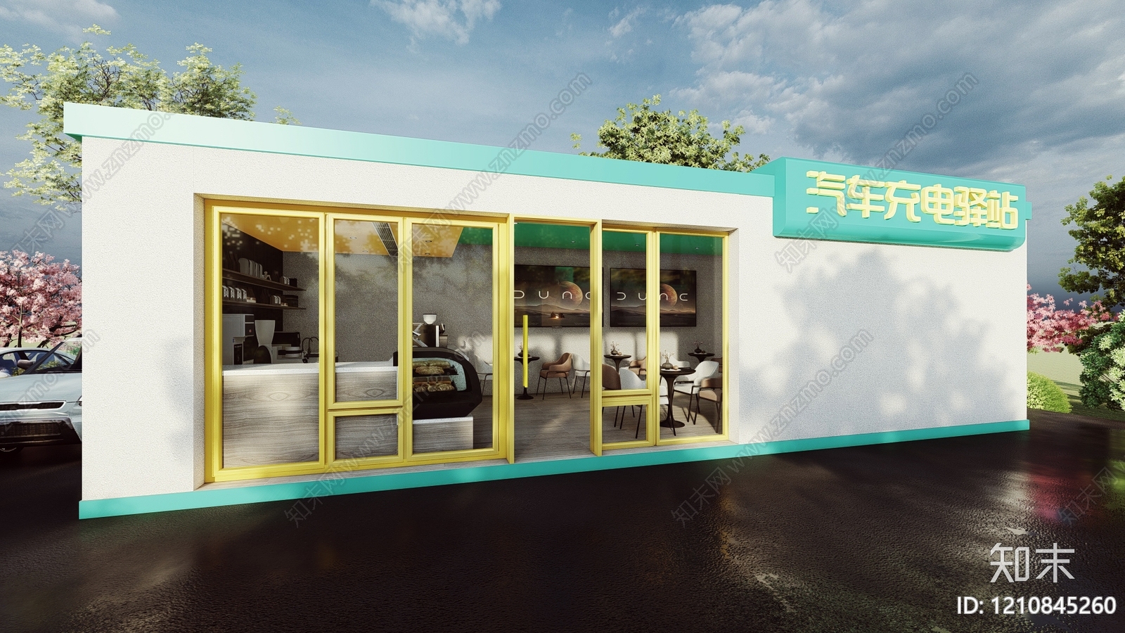 - 新中式现代商场建筑 汽车充电站 充电驿站 奶茶店 咖啡馆 车主休息室