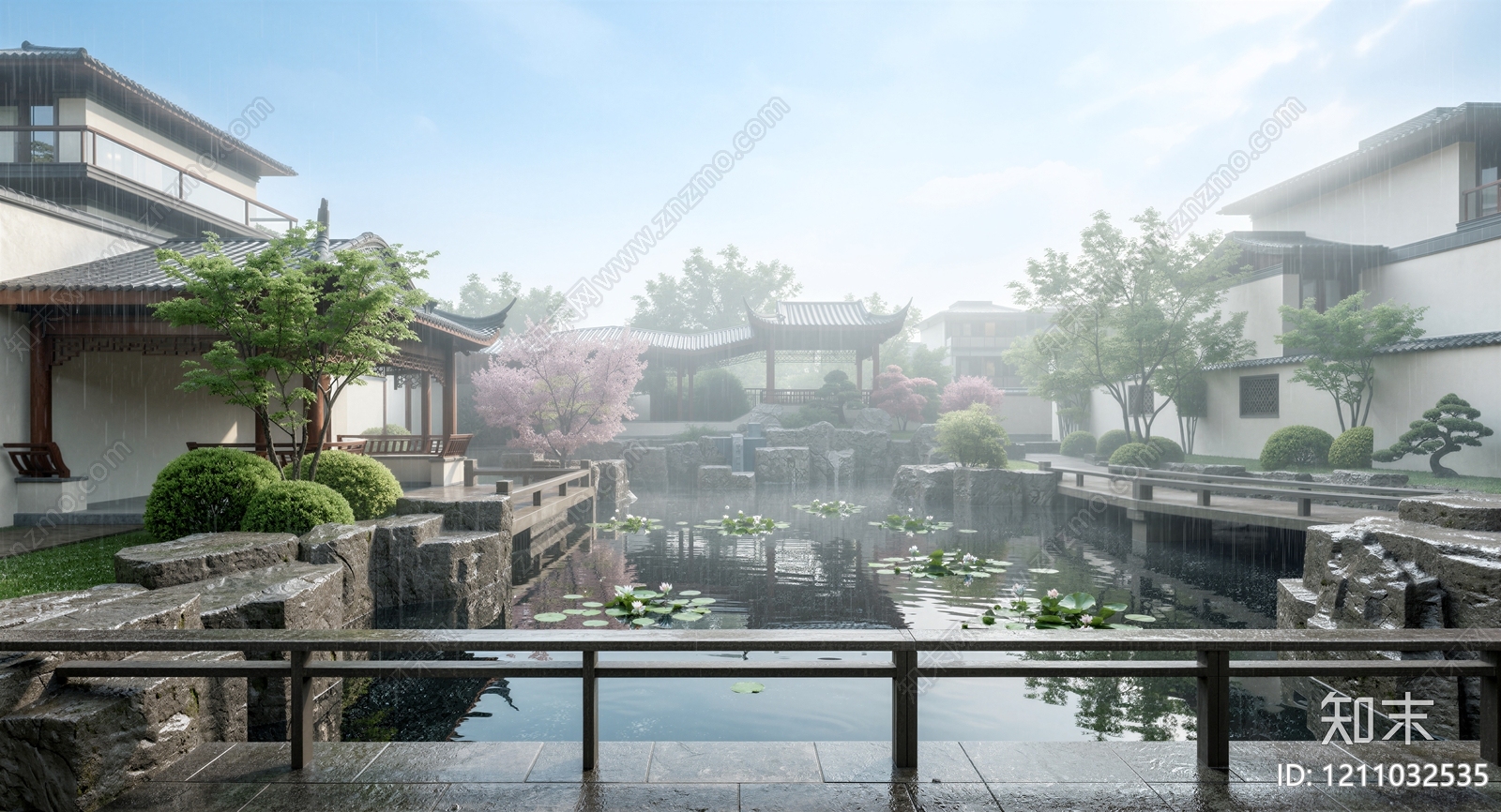 - 新中式别墅庭院 现代中式精致轻奢 木方亭廊水钵