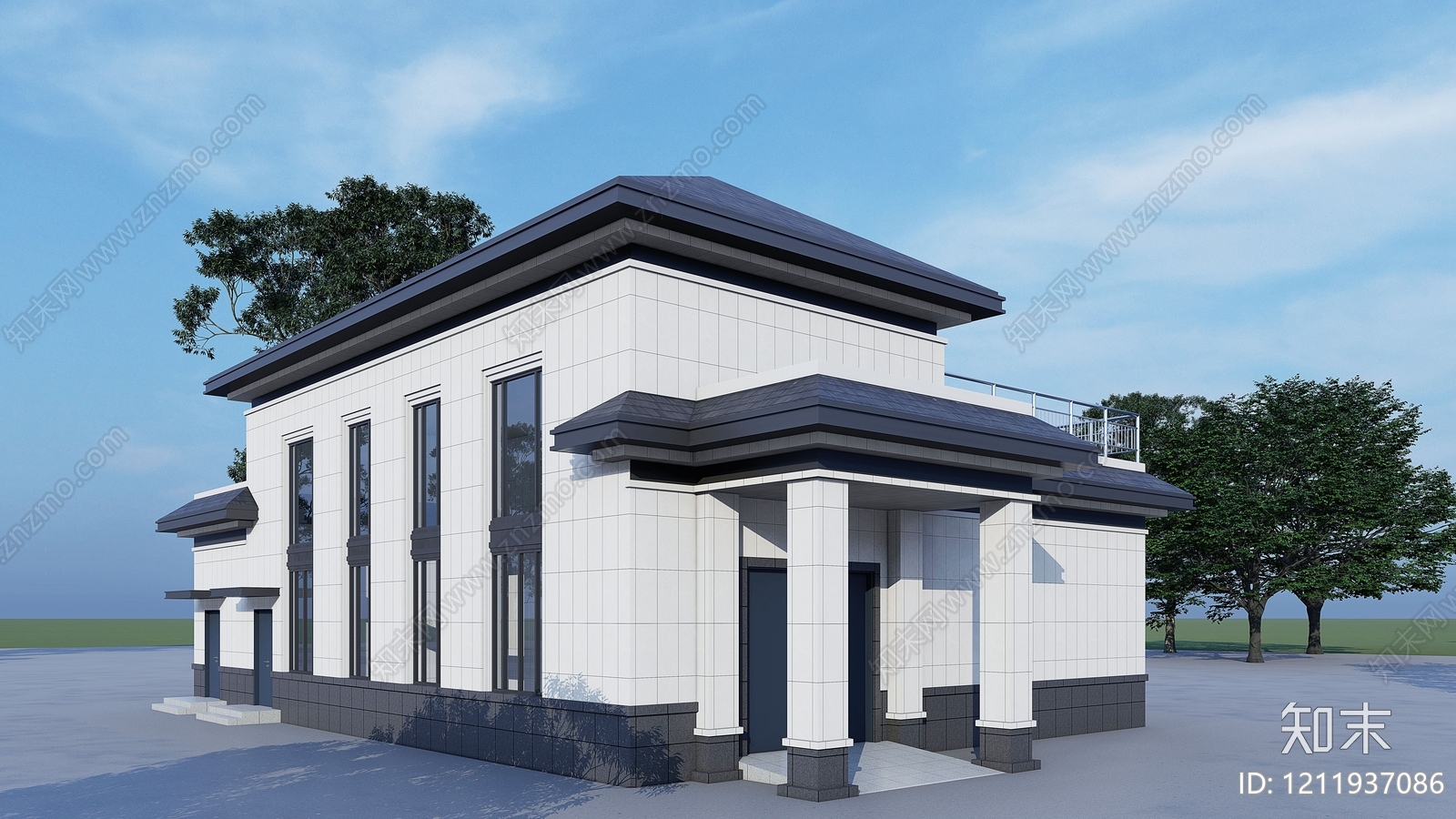- 新中式小公建 宋式景观会客厅 新中式销售中心 特色金属编织格栅 坡屋顶矮栏杆古建