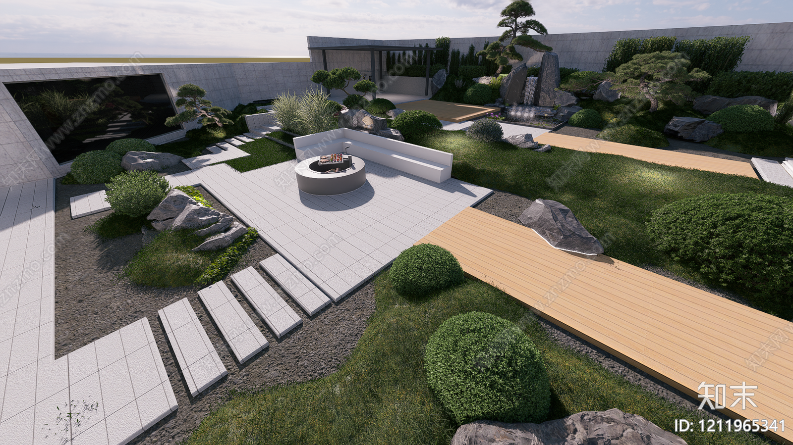 - 新中式别墅庭院 现代别墅花园景观 植物 石子