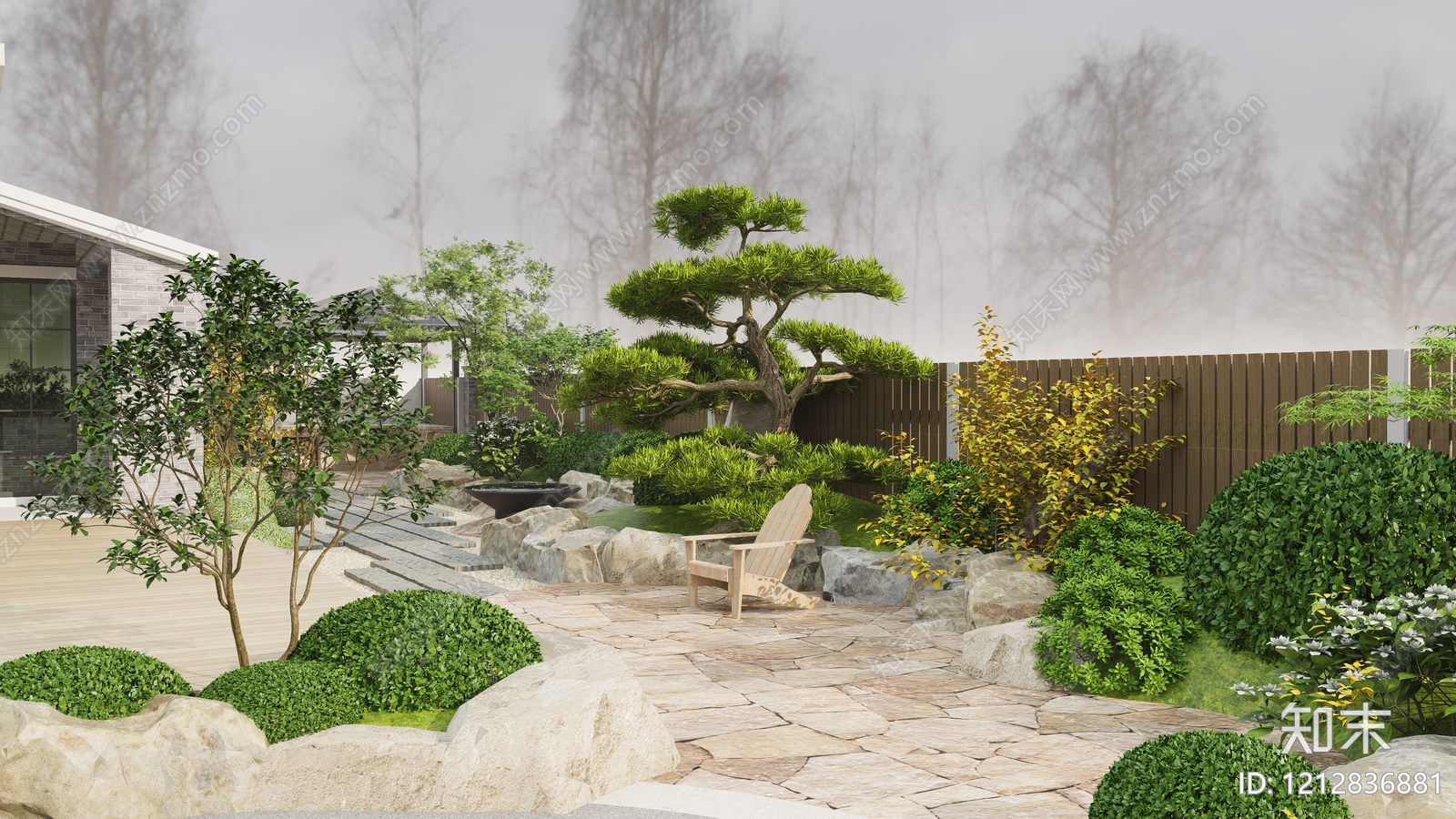日式禅意别墅庭院 景观石 植物 松树 操作台 面包窑