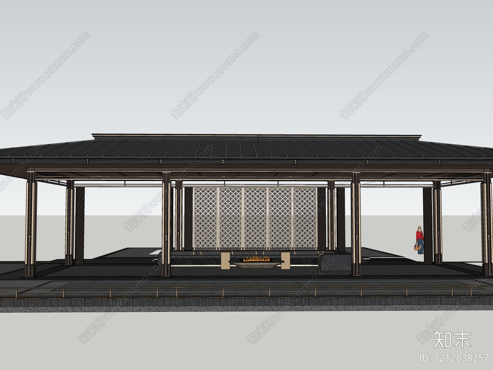 - 新中式廊架 宋式景观廊架 单边斜屋顶造型 金属编织格栅 对景景墙
