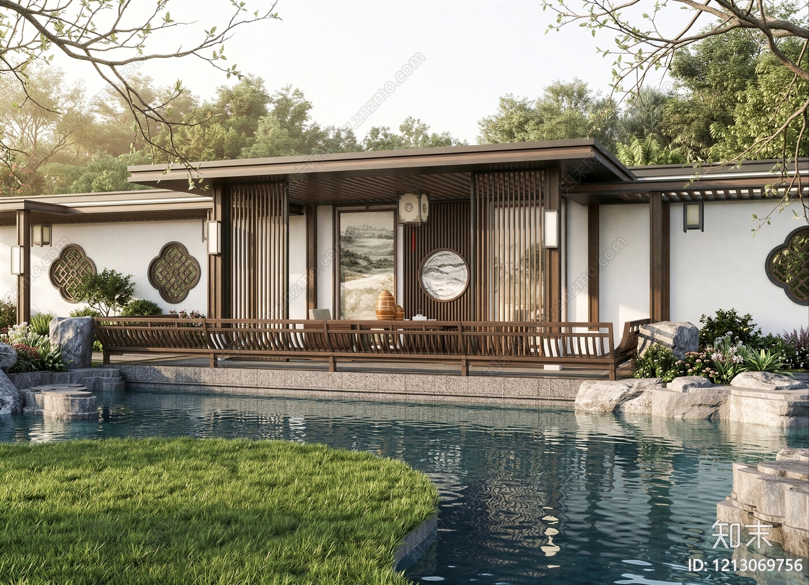 - 新中式别墅庭院 现代新中式宅院 木方亭