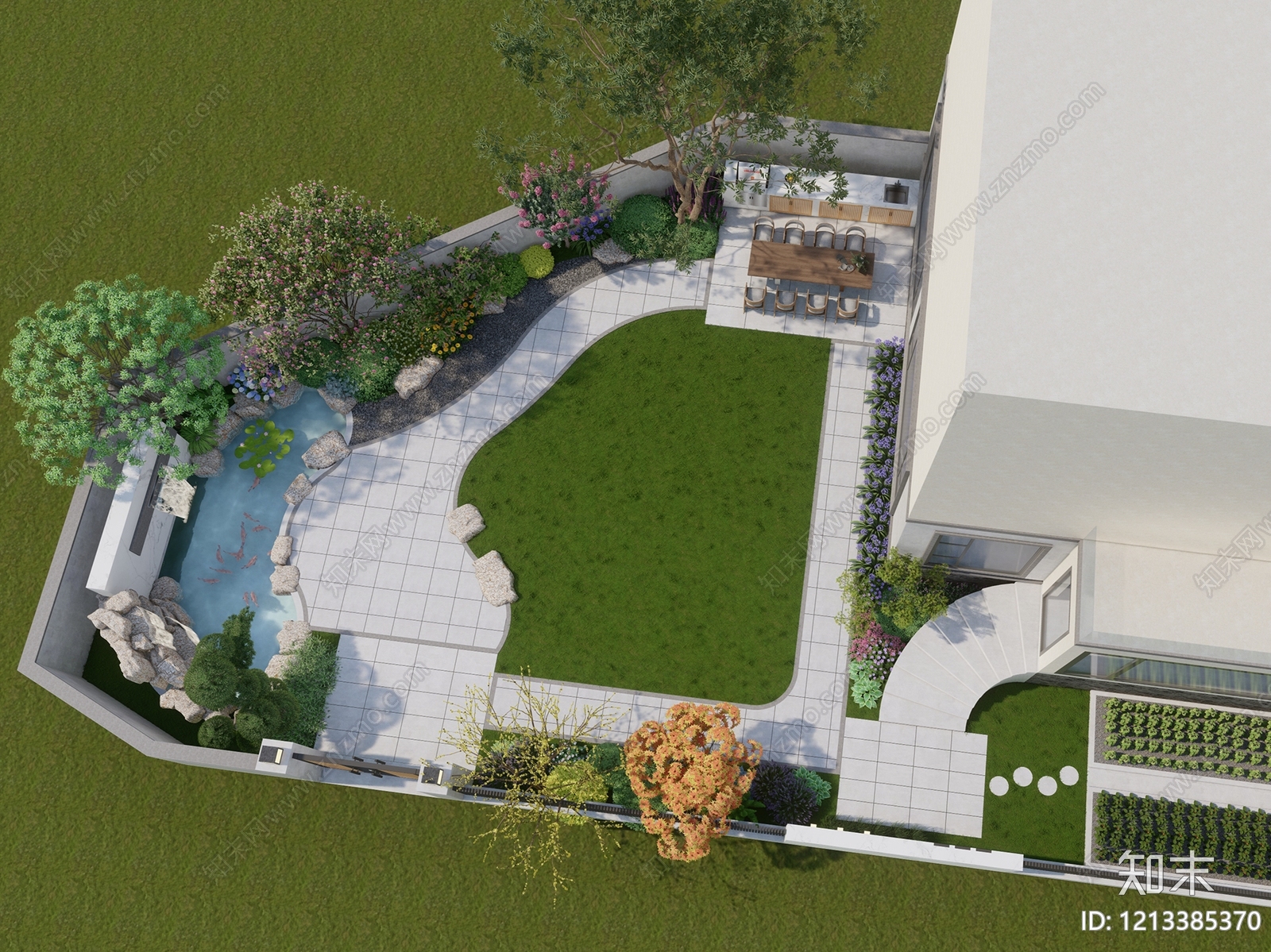 - 新中式别墅庭院 现代别墅花园景观 植物 石子