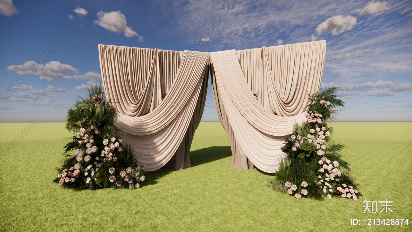 奶油风其他美陈 韩式布幔简约婚礼 布幔皱褶挽布入口 婚礼美陈背景 绣球绿植地花组合
