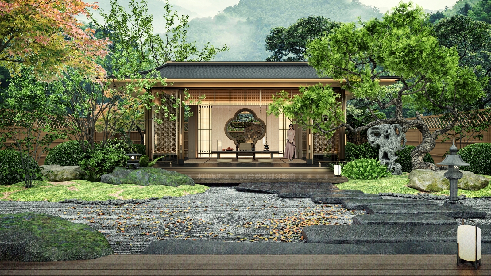 - 新中式景观别墅庭院 假山 假山水景 景墙