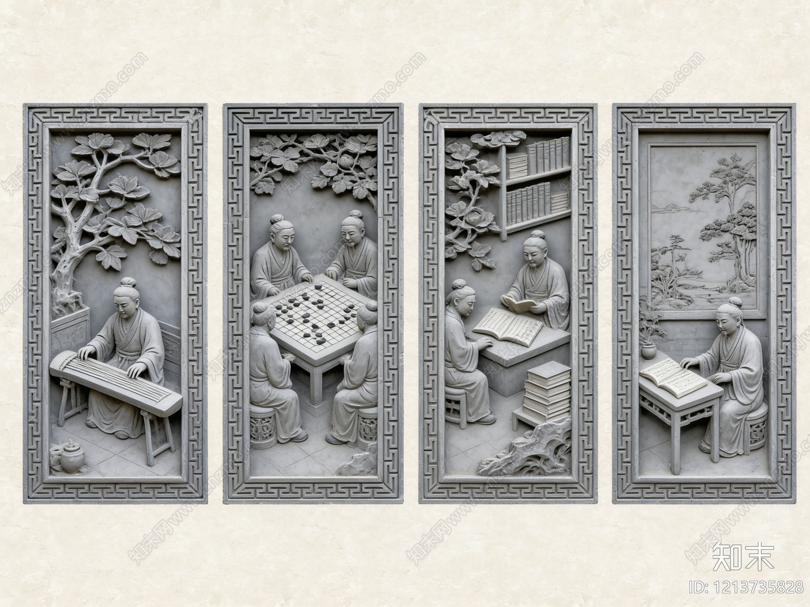 新中式浮雕 2D砖雕 琴棋书画 石材雕花 景墙照壁 砖雕图案贴图