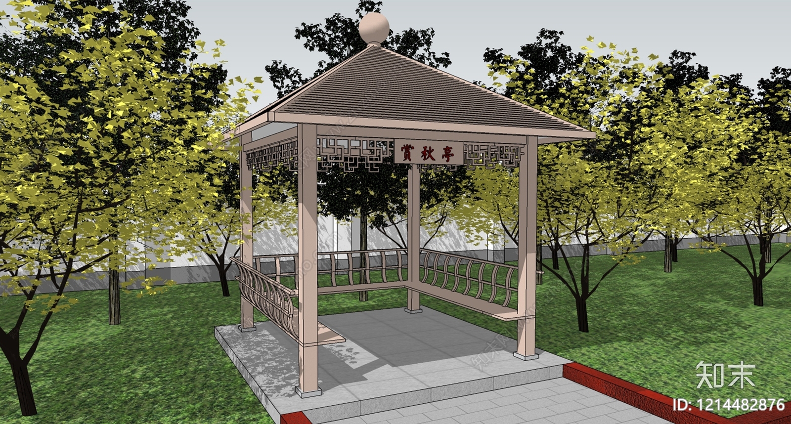 - 新中式亭子 新中式观景亭 斜屋顶特色格栅 挂帘文化铺装 梅花纹