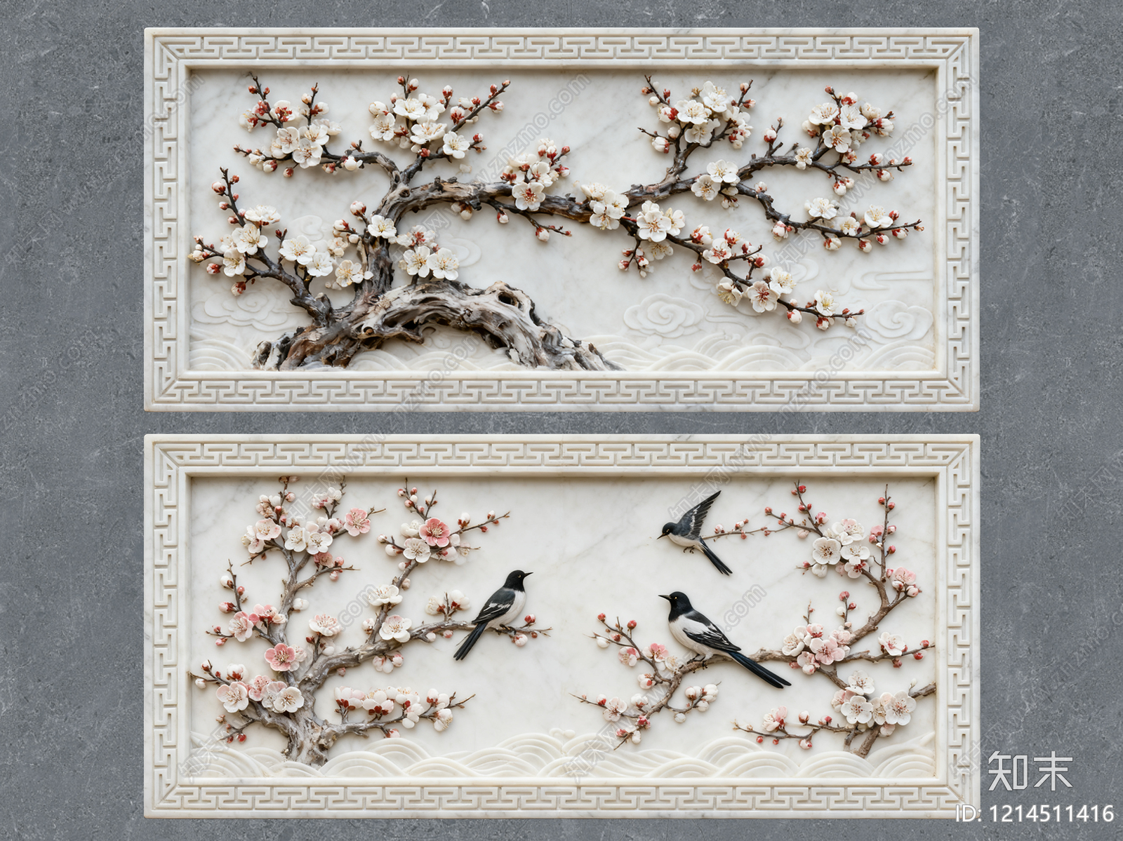 新中式浮雕 2D浮雕图案 梅花 喜上眉梢 汉白玉浮雕 景墙照壁