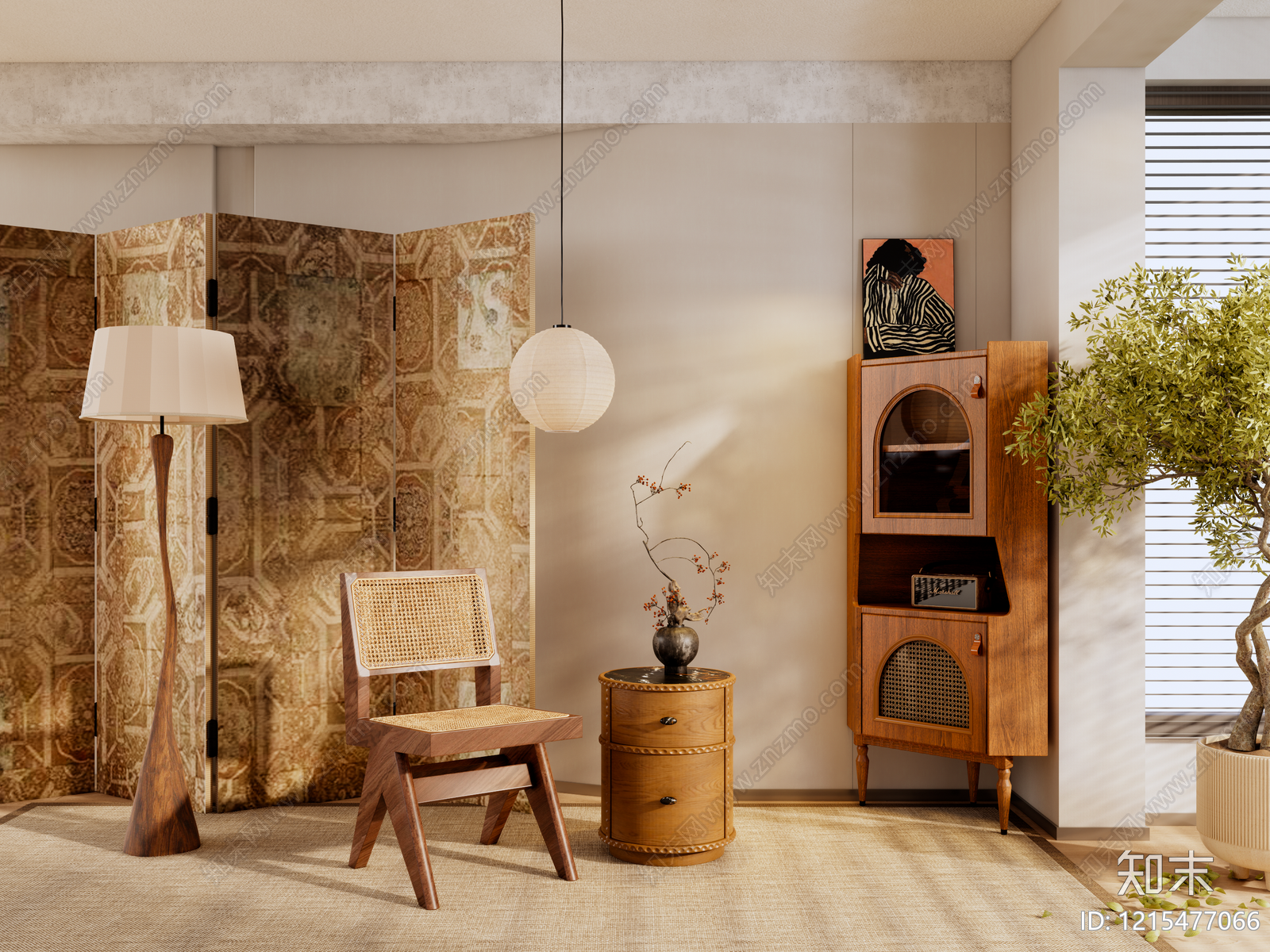 中古风家居客厅 现代中古客厅家具 中古藤编单椅 中古吊灯落地灯 现代中古边柜 中古茶几装饰画